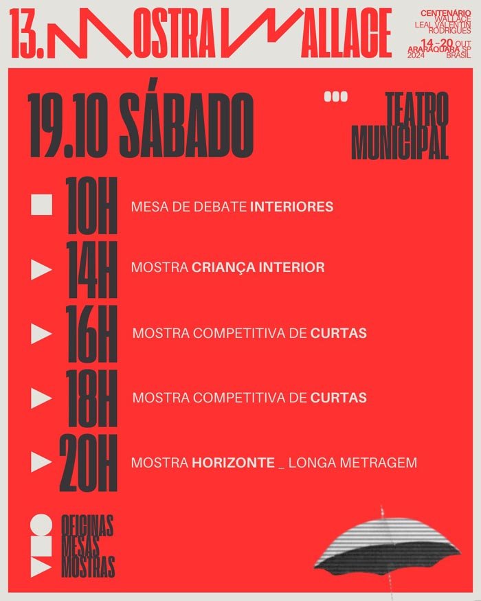 A 13ª Mostra de Cinema Wallace Leal Valentin Rodrigues, neste sábado (19), apresenta diversas atividades gratuitas no Teatro Municipal: Mesa de debate “Interiores” (10h), Mostra “Criança Interior” (14h), Mostra competitiva de Curtas (16h), Mostra competitiva de Curtas (18h), e Mostra “Horizonte” (longa-metragem, 20h).