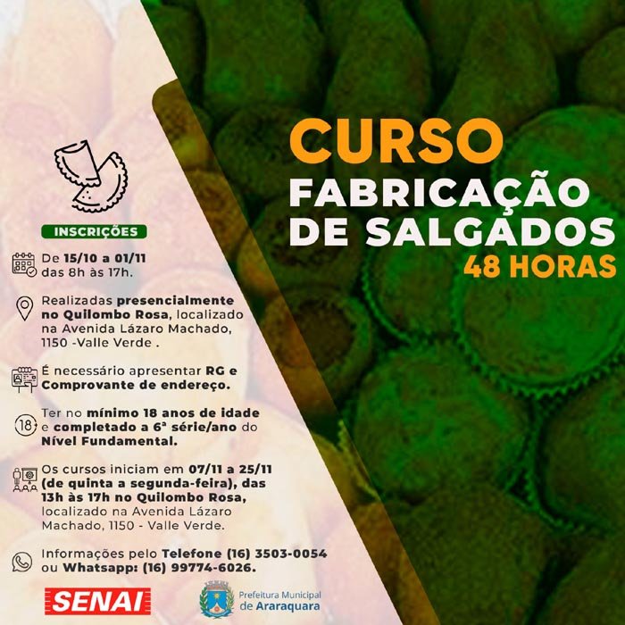 Já para o curso de fabricação de salgados, o prazo para a inscrição é até 1 de novembro, também de segunda a sexta-feira das 8 às 17 horas, no Quilombo Rosa. As aulas serão ministradas de 7 a 25 de novembro, das 13 às 17 horas.