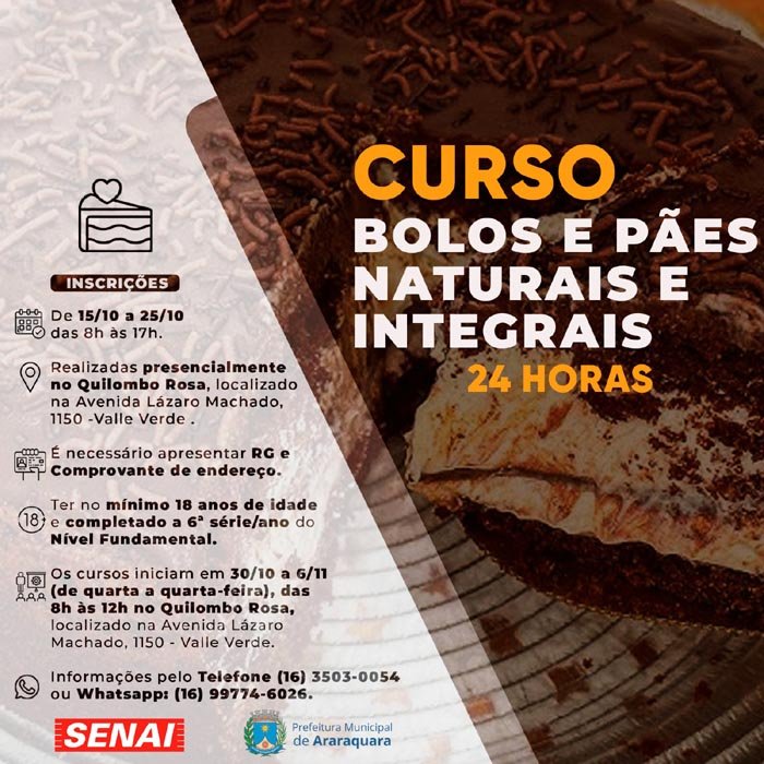 Para o curso de bolos e pães naturais e integrais, a inscrição deve ser feita até esta sexta-feira, dia 25 de outubro, de segunda a sexta-feira, das 8 às 17 horas, no próprio Quilombo Rosa, onde as aulas serão ministradas de 30 de outubro a 6 de novembro, das 8 às 12 horas.