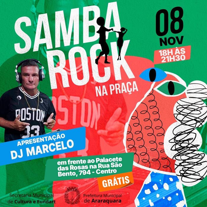 Nesta sexta-feira (08) tem “Samba Rock na Praça” a partir das 18 horas. O evento gratuito da Secretaria Municipal de Cultura e Fundart será realizado em frente à sede da Secretaria, no Palacete das Rosas Paulo A.C. Silva, localizada ao lado da Prefeitura, na Esplanada das Rosas.