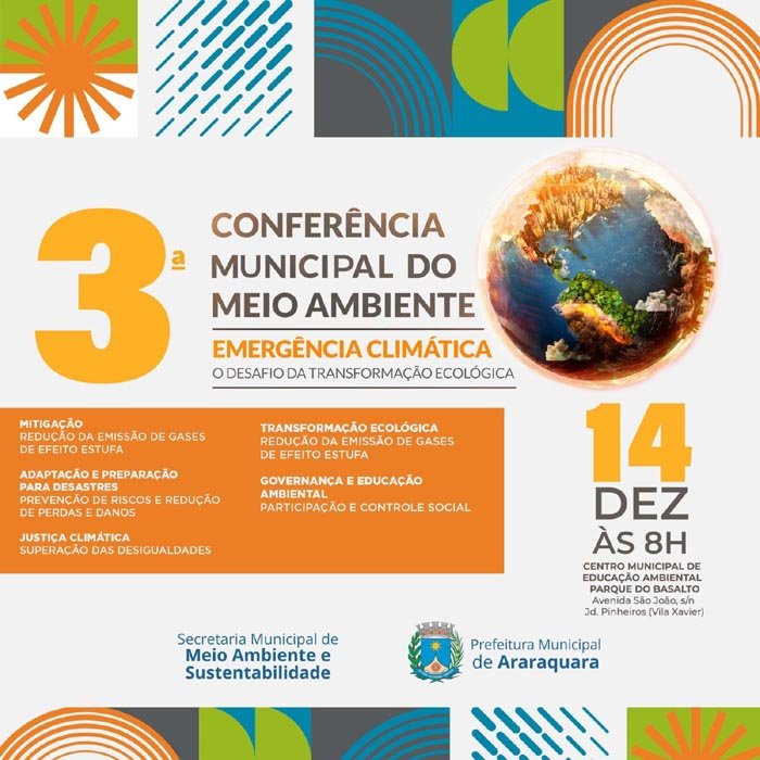 A Prefeitura de Araraquara, por meio da Secretaria Municipal de Meio Ambiente e Sustentabilidade e Secretaria Municipal de Direitos Humanos e Participação Popular, realizará, no dia 14 de dezembro, a 3ª Conferência Municipal do Meio Ambiente, às 8 horas.