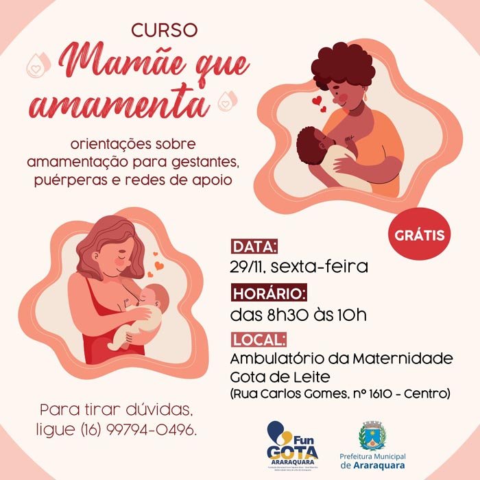 A Prefeitura de Araraquara e a Maternidade Gota de Leite "Vovó Mocinha" – Fungota realizam, nesta sexta-feira (29), o curso gratuito “Mamãe que Amamenta”, com o objetivo de prestar orientações sobre amamentação para gestantes puérperas e redes de apoio.