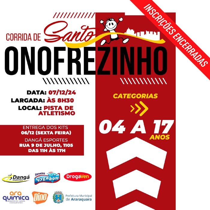 Direcionada a crianças e jovens de 4 a 17 anos de idade, a Santo Onofrezinho será realizada neste sábado, dia 7 de dezembro, com largada a partir das 8h30 na Pista de Atletismo Armando Garlippe, no complexo esportivo do Ginásio Guilherme Fragoso Ferrão, no bairro São Geraldo.