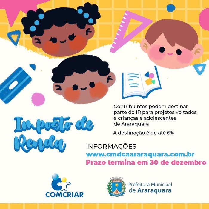Os contribuintes têm até o dia 30 de dezembro para direcionar até 6% do Imposto de Renda (IR) para instituições de assistência a crianças e adolescentes do município. A destinação é direcionada ao Fundo Municipal dos Direitos da Criança e do Adolescente, gerido pelo Conselho Municipal dos Direitos da Criança e do Adolescente de Araraquara (Comcriar).
