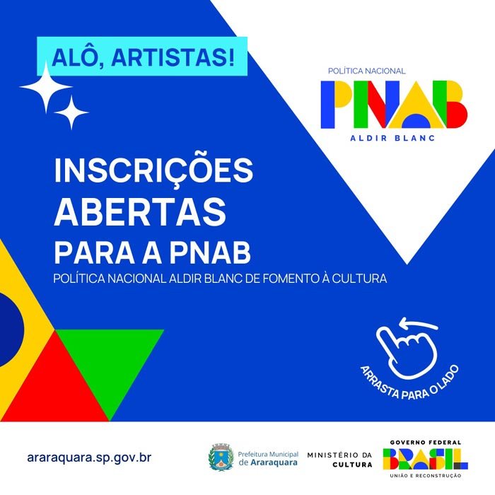 A Secretaria Municipal de Cultura divulgou no site da Prefeitura de Araraquara a lista de inscritos na PNAB - Política Nacional Aldir Blanc de Fomento à Cultura, e comemora o total de 226 projetos inscritos na modalidade “linguagens artísticas” que contempla: Artes Visuais, Arte Circense, Artesanato, Audiovisual, Capoeira, Carnaval, Cultura Hip Hop, Dança, LGBTQIAPN+, Literatura, Música e Teatro.