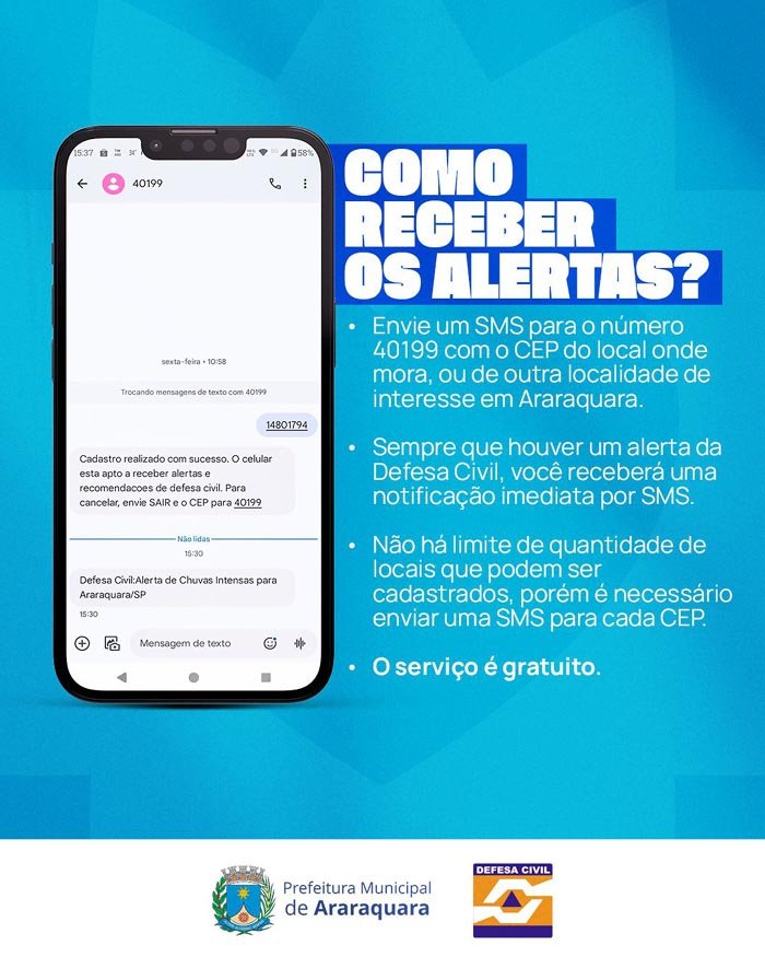 Os munícipes que tiverem interesse em receber os alertas por mensagem no celular devem enviar uma SMS para o número 40199 com o CEP do local onde mora, ou de outra localidade de interesse em Araraquara. Não há limite de quantidade de locais que podem ser cadastrados, porém é necessário enviar uma SMS para cada CEP. O serviço é gratuito.