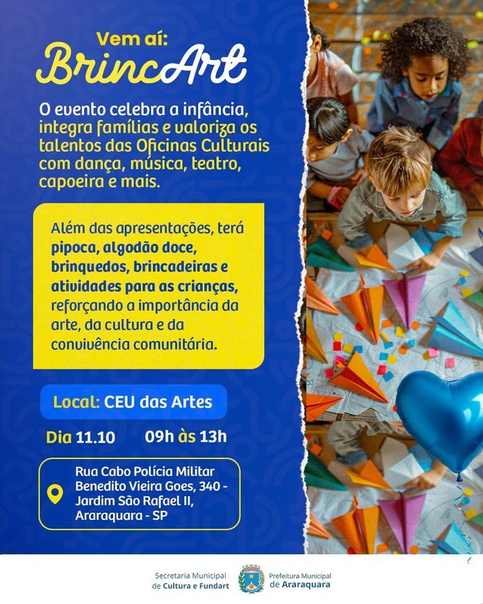 A Secretaria de Cultura e Fundart realizam um evento especial em comemoração ao Dia das Crianças no próximo dia 11 de outubro (sábado), das 9h às 13h, no CEU das Artes, localizado no Jardim São Rafael II. Apresentações das Oficinas Culturais, atividades, brincadeiras, brinquedos, pipoca e algodão doce estão na programação gratuita.