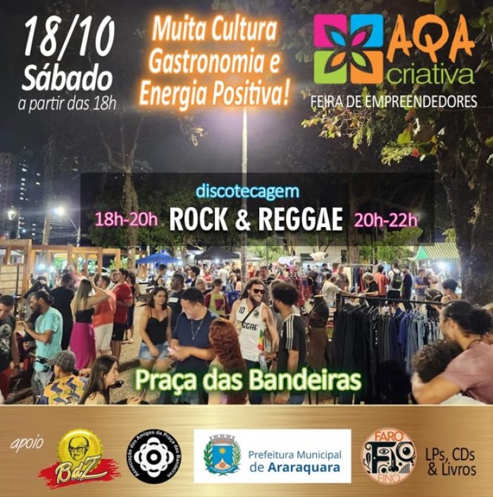 A feira de empreendedores AQA Criativa é atração gratuita neste sábado, dia 18 de outubro, na Praça das Bandeiras, das 18h às 22h, em uma realização do coletivo AQA Criativa, com apoio da Secretaria Municipal de Desenvolvimento Econômico, via Subsecretaria do Trabalho e da Economia Criativa e Solidária.