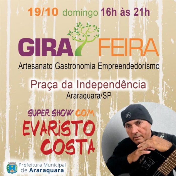 O GiraFeira estará na Praça da Independência neste domingo, 19 de outubro, das 16h às 21h, com programação gratuita, em uma realização do Coletivo GiraFeira com o apoio da Prefeitura de Araraquara, por meio da Secretaria Municipal de Desenvolvimento Econômico, via Subsecretaria do Trabalho e da Economia Criativa e Solidária.