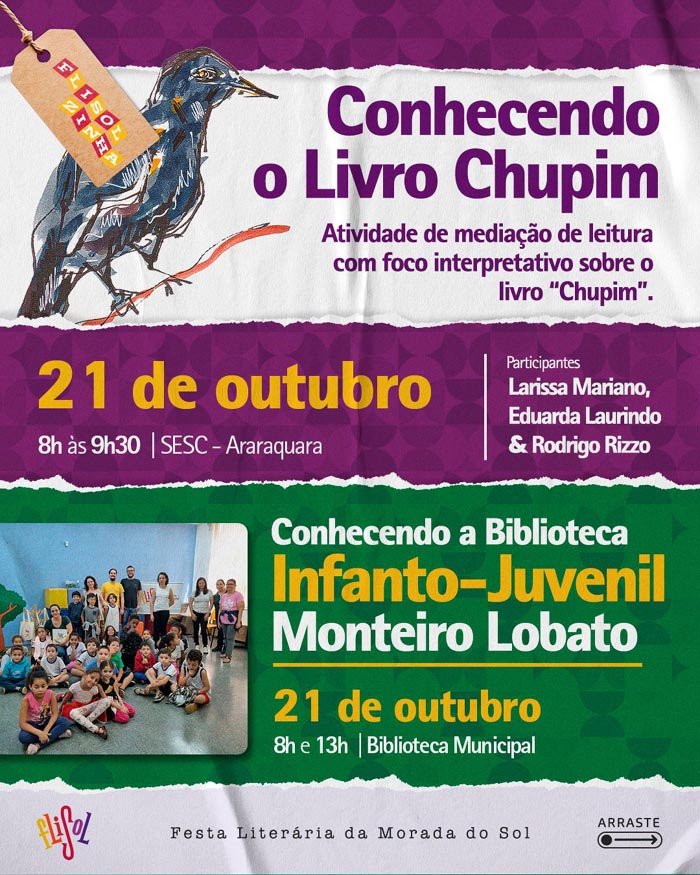 Nesta semana, a FliSolzinha – programação infantil da Festa Literária da Morada do Sol (FliSol) – mais uma vez promove encontros que buscam aproximar crianças e livros, incentivando desde cedo o gosto pela leitura e a valorização dos espaços públicos de cultura. Nesta terça (21) a atividade será realizada na Biblioteca Infantojuvenil Monteiro Lobato e também no Sesc Araraquara.