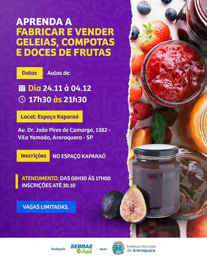 A Prefeitura de Araraquara, em parceria com o Sebrae, oferece em novembro dois cursos gratuitos voltados à qualificação profissional e ao fortalecimento do empreendedorismo: “Fabricação de Panetones e Doces Natalinos” e “Fabricação de Geleias, Compotas e Doces de Frutas”.