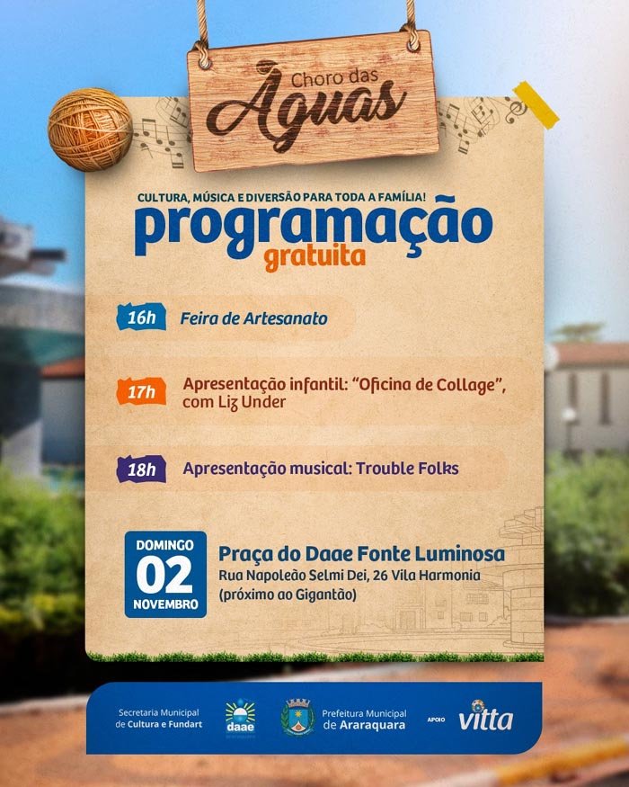 A programação do Choro das Águas deste domingo (02) começa às 16h com a Feira de Artesanato; depois segue com a oficina infantil de “Collage”, às 17h, com a artista premiada no Território da Arte, Liz Under; e se encerra com o show musical de Trouble Folks, às 18h, com show “Trouble num sonho antigo”. A programação, realizada pela Secretaria Municipal de Cultura e Fundart, é gratuita e é realizada na Praça do Daae – Fonte Luminosa, com apoio da Vitta Araraquara - Construtora e Incorporadora.