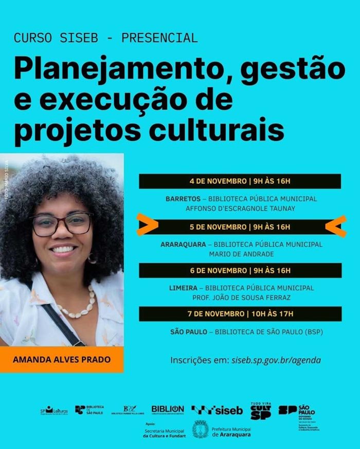 Nesta quarta-feira, 5 de novembro, a Biblioteca Municipal Mário de Andrade recebe o curso presencial gratuito “Planejamento, gestão e execução de projetos culturais”, com Amanda Alves Prado, das 9h às 16h. Realizado com o apoio da Secretaria Municipal de Cultura e Fundart, o curso ainda está com inscrições abertas.
