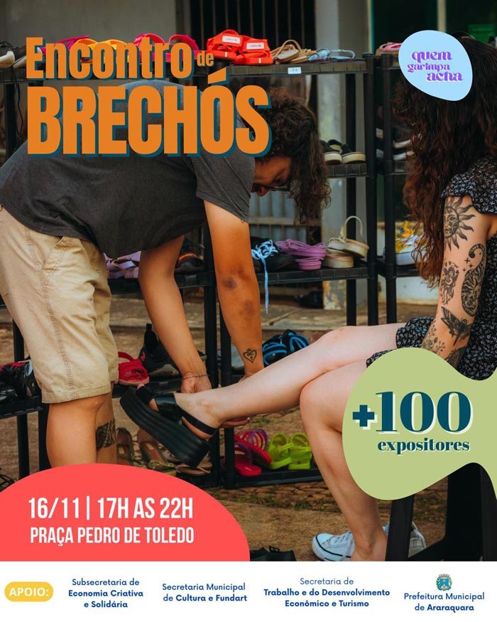 Mais de 100 expositores se reúnem neste domingo, 16 de novembro, na Praça Pedro de Toledo para o Encontro de Brechós Quem Garimpa Acha, das 17h às 22 horas. A programação gratuita é uma realização do Coletivo Quem Garimpa Acha e conta com apoio da Secretaria de Trabalho e do Desenvolvimento Econômico e do Turismo, por meio da Subsecretaria de Economia Criativa e Solidária.