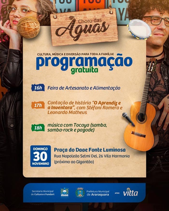 O Choro das Águas apresenta uma programação de lazer neste domingo, 30 de novembro, na Praça do Daae – Fonte Luminosa, com as atividades realizadas pela Prefeitura de Araraquara, por meio da Secretaria Municipal de Cultura e Fundart, em parceria com Vitta Construtora e Incorporadora e apoio do DAAE.