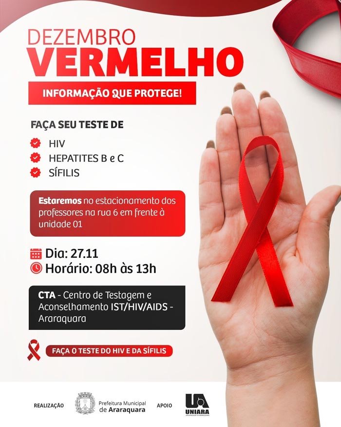 A equipe do Centro de Testagem e Aconselhamento (CTA) irá realizar no dia 1º de dezembro, segunda-feira, testes rápidos gratuitos para HIV, sífilis, hepatite B e hepatite C. O atendimento acontece das 9h30 às 16h em frente à Prefeitura: Rua São Bento, 840, Centro. Além da testagem, também haverá distribuição de preservativos e folhetos informativos com orientações sobre prevenção.