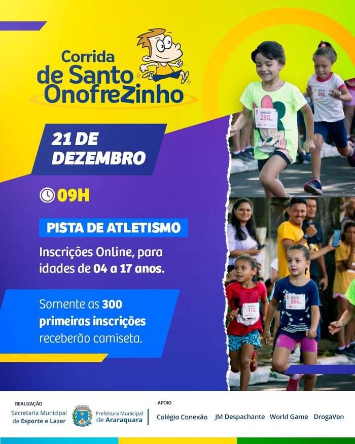 Por meio da Secretaria Municipal de Esportes e Lazer, a Prefeitura realiza no próximo dia 21 de dezembro (domingo), às 9h, no Ginásio da Pista Armando Garlippe, em Araraquara, a tradicional Corrida de Santo Onofrezinho.