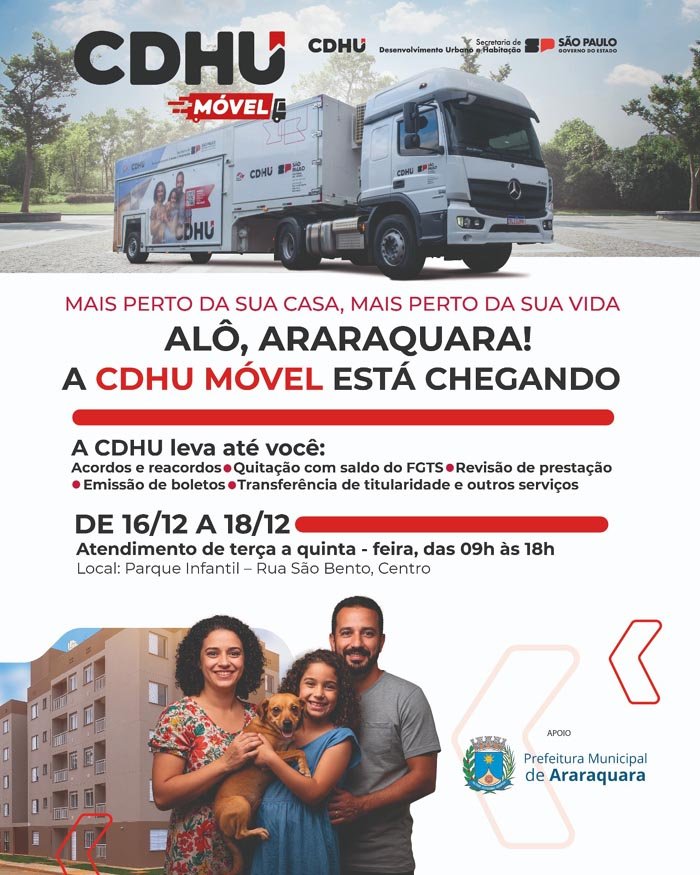 Em parceria com a Prefeitura, a Companhia de Desenvolvimento Habitacional e Urbano (CDHU) traz a Araraquara o serviço CDHU Móvel. A unidade, que oferece atendimento direto aos mutuários, estará instalada no Parque Infantil, localizado na Rua São Bento, entre as Avs. Prof. Jorge Corrêa e São Geraldo – Centro, entre os dias 16 e 18 de dezembro (terça a quinta-feira), das 9h às 18h. Haverá também atendimentos do Departamento Autônomo de Água e Esgotos (DAAE), do Centro de Testagem e Aconselhamento (CTA) e da concessionária de energia CPFL.