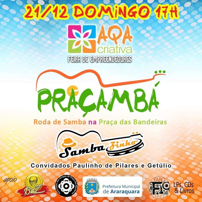Programação neste domingo (21) começa às 17h e conta com roda de samba na praça com SambaZinho