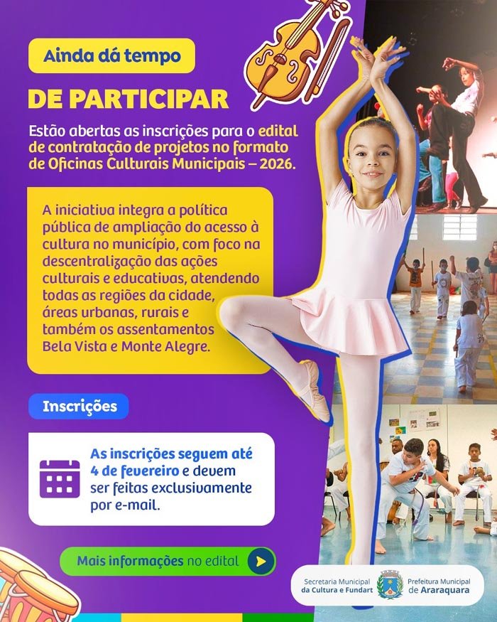 O prazo para a inscrição no edital da Secretaria Municipal de Cultura e Fundart, para contratação de projetos no formato de Oficinas Culturais Municipais ao longo de 2026, segue até a próxima quarta-feira, 4 de fevereiro.