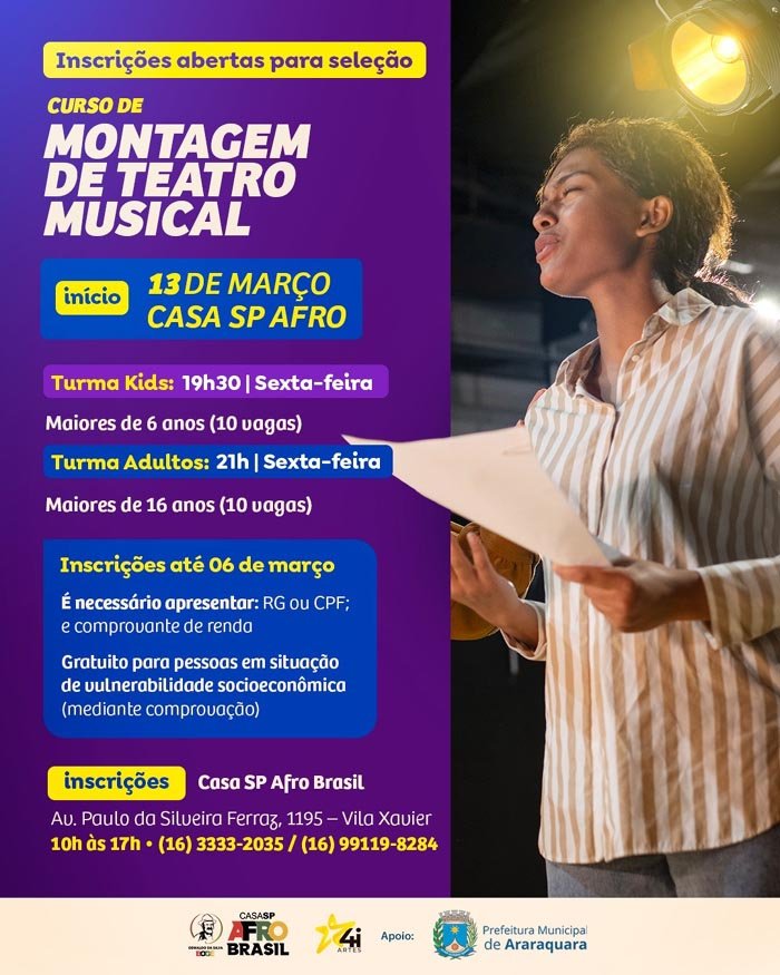 O curso “Montagem de Teatro Musical” ganha destaque na programação da Casa SP Afro, em uma parceria efetuada com o grupo 4i Artes e com o apoio da Secretaria Municipal de Direitos Humanos e Cidadania, por meio da Subsecretaria de Políticas Públicas Étnico Raciais. Com uma turma para crianças e outra para adultos, a atividade está com inscrições abertas até o próximo dia 6 de março.