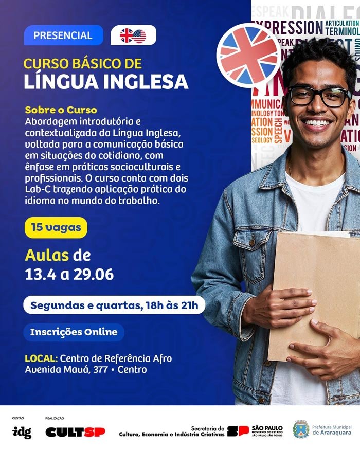 A Escola de Inovação e Sustentabilidade, do Governo de SP, por meio do CultiSP Pro – Escolas de Profissionais da Cultura, chega a Araraquara em uma parceria com a Secretaria de Cultura e Fundart e Centro de Referência Afro Mestre Jorge, e oferece gratuitamente um curso básico de Língua Inglesa, na modalidade presencial. São 15 vagas gratuitas com inscrições abertas até o próximo dia 8 de março, para pessoas a partir de 16 anos.