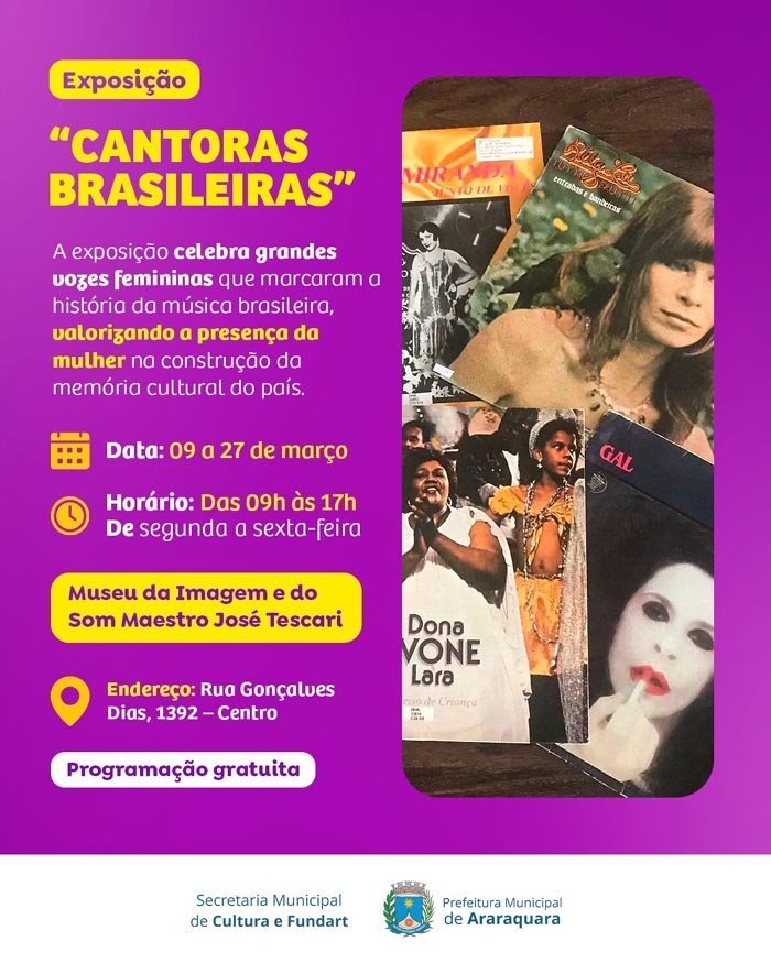 O MIS - Museu da Imagem e do Som Maestro José Tescari, em comemoração ao Mês das Mulheres, inicia a exposição “Cantoras Brasileiras” na próxima segunda-feira, 9 de março. Realizada pela Secretaria Municipal de Cultura e Fundart, a exposição fica em cartaz até o dia 27 de março com entrada gratuita.