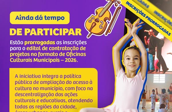 Os interessados em ingressar no programa Oficinas Culturais Municipais têm um período maior para realizar suas inscrições: a Secretaria Municipal de Cultura e a Fundart prorrogaram o prazo até o dia 13 de março.