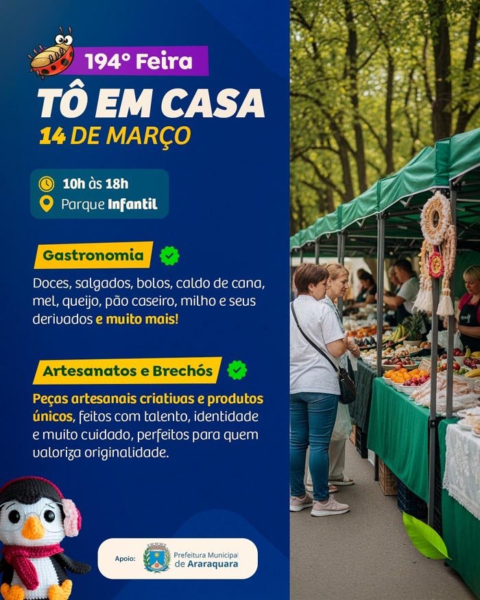 Realizada pelo Coletivo Tô em Casa, com apoio da Prefeitura de Araraquara por meio da Secretaria Municipal de Desenvolvimento Econômico, via Subsecretaria do Trabalho e da Economia Criativa e Solidária, a feira se consolidou como um espaço que valoriza a economia criativa e fortalece o convívio comunitário.