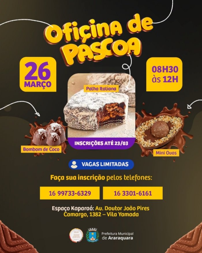 A atividade acontecerá das 8h30 às 12h no Espaço Kaparaó, localizado na Av. Dr. João Pires de Camargo, 1382 – Vila Yamada. Serão ensinadas técnicas de preparação, manipulação correta e comercialização de produtos de chocolate como bombons, mini ovos e palha italiana. A oficina é aberta à população e qualquer pessoa pode participar.