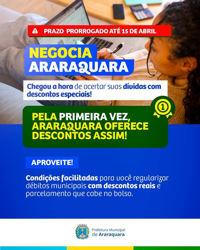 A Prefeitura de Araraquara publicou nesta segunda-feira (30) mais um edital de prorrogação de vigência do programa "Negocia Araraquara". O novo prazo para adesão vai até o dia 15 de abril, oferecendo aos cidadãos a oportunidade de quitar débitos fiscais junto ao poder público municipal com desconto e possibilidade de parcelamento.