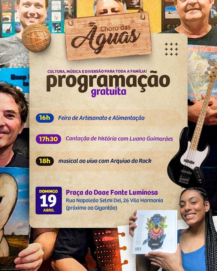 O Choro das Águas deste domingo, 19 de abril, chega repleto de arte e cultura, reunindo feira de artesanato e alimentos, contação de histórias e música ao vivo, com uma programação gratuita pensada para toda a família na Praça do Daae – Fonte Luminosa.