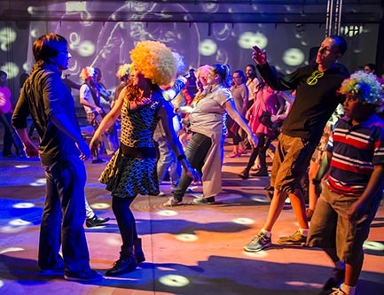 Nos embalos da Black Music dos anos 80, com iIuminação e projeções que remetem aos bailes dos anos 70 e 80, em Discoteque o público também entra na dança