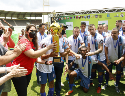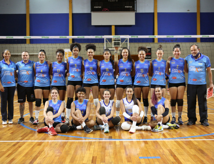 Com a segunda vitória sobre São Carlos, por 3 a 2, no Ginásio da Pista, meninas erguem a taça após o nono jogo sem derrota