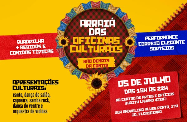Canto, dança de salão, capoeira, samba rock, dança do ventre, orquestra de violões serão apresentados na festa julina que tem início às 19h