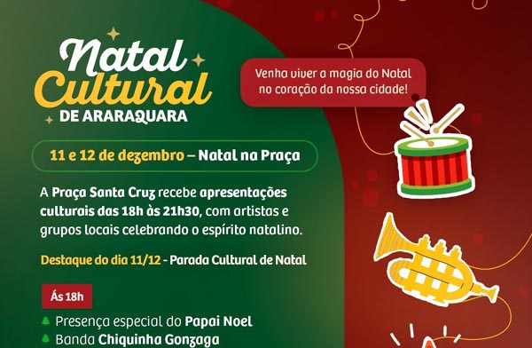 “Natal Cultural de Araraquara” conta com a programação do “Natal na Praça”, na Praça Santa Cruz (dias 11 e 12) e a “Parada Cultural de Natal”, com percurso na Rua 2 (dia 11)