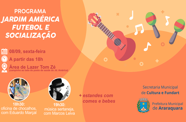 Programação apresenta: Oficina de Chocalhos com Eduardo Marçal, às 18h30, e a apresentação de música sertaneja com Marcos Leiva, às 19h30