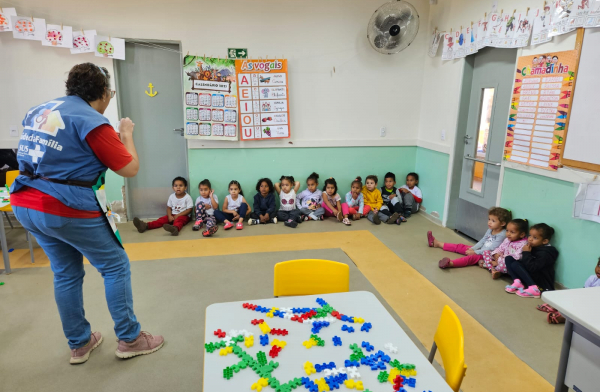 Por meio de atividades lúdicas, as crianças são orientadas sobre escovação e passam por avaliação bucal com dentistas da rede