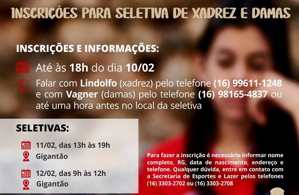 Provas para candidatos de damas e xadrez serão disputadas nos dias 11 e 12 de fevereiro